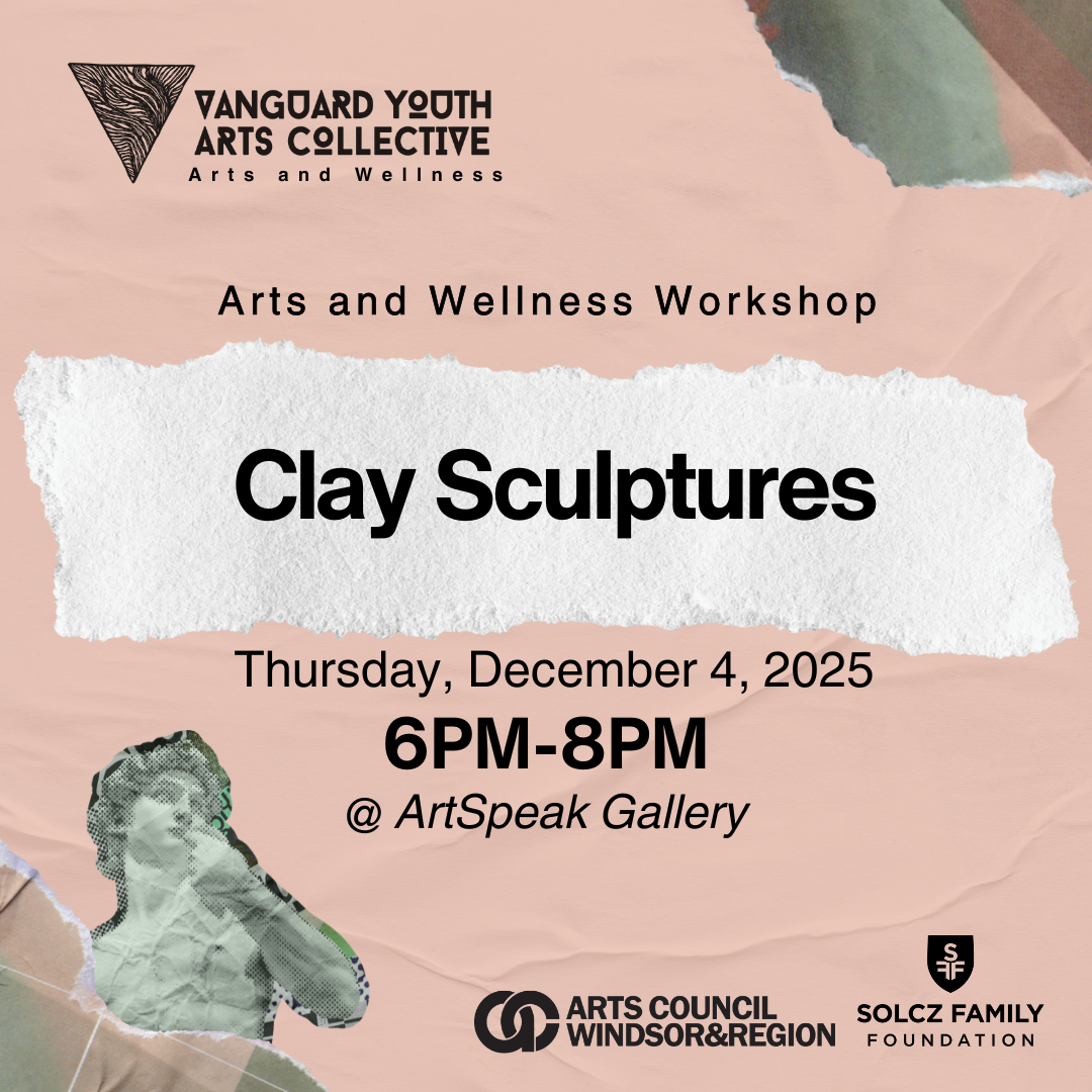 CALL FOR SUBMISSIONS: Mistletoe & Snow . Our winter members exhibition and sale is back! Call for submissions is open until… Intuitive Watercolour & Drawing | Vanguard Arts & Wellness November 27 @ 6:00 pm - 8:00 pm Clay Sculptures | Vanguard Arts & Wellness December 4 @ 6:00 pm - 8:00 pm Windsor & Region Arts Events Upcoming at the ACWR At ArtSpeak Gallery The ACWR office is currently open during the following hours: M: Closed T: 1-5pm W: 1-7pm Th: 1-5pm F: 1-5pm Sign Up for the Arts Notes! Receive a weekly newsletter that keeps you up to date on all arts events and opportunities in Windsor-Essex. Sign Up
