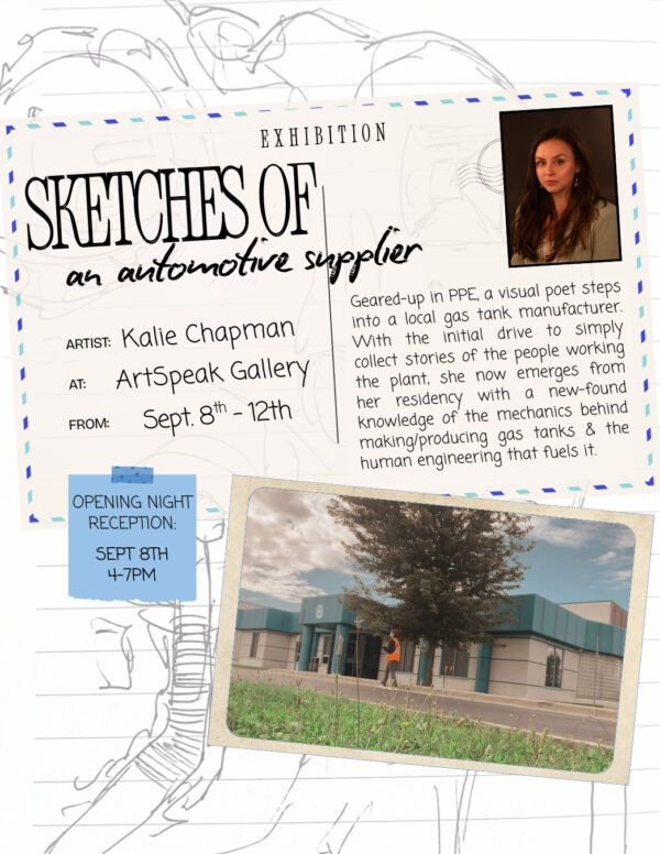 We’re thrilled to welcome Kalie Chapman as the third Artist-in-Residence in our Creatives at Work program. Kalie is spending 6 weeks at Kautex during August and September, exploring new work inspired by the space and its community. Now, she is hosting an exhibition, showcasing the work created during her residency at ArtSpeak Gallery, on display September 8 – September 12. With an Opening Reception Monday, September 8th from 4-7pm and a Visual Poetry Workshop September 12th, from 3:30 -5:00pm.