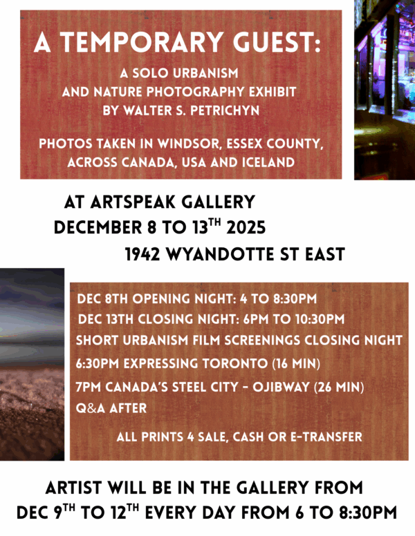An urbanism and nature photography exhibit by Walter S. Petrichyn. This retrospective, spanning from 2009 to 2024, will showcase photographs taken in Windsor and Essex County, across Canada, the United States and Iceland. The show focuses on the ephemeral experience of urban life and the healing aspects of nature. From a cyclist biking through the Wyandotte Drouillard underpass to colorful buildings in Dawson City, Yukon, these images encompass the experience of being a temporary guest in this world. Artist will be in the gallery from Dec 9 – 12, everyday from 6 – 8:30pm, following standard daily ACWR hours of operation.