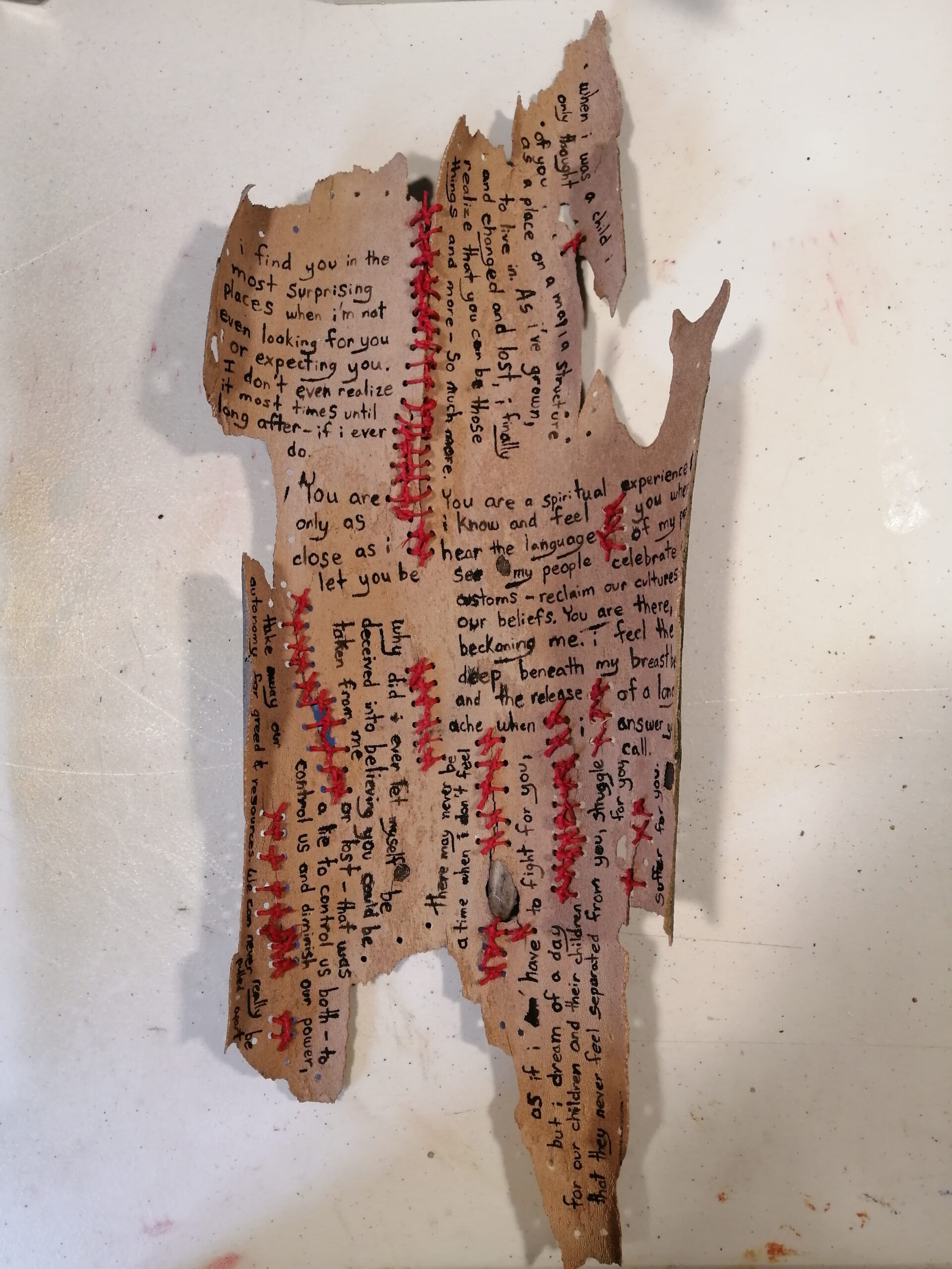 Ostoro Petahtegoose is a biracial, Nishinaabe of Atikameksheng Anishnawbek with European descent, born and raised in the traditional territories of the Three Fires Confederacy of First Nations, comprised of the Ojibway, the Odawa, and the Potawatomie, also known as Waawiiye’adinong (the place where the river bends – Windsor, Ontario.) Ostoro is an Indigiqueer, transgender, nonbinary writer, Goldsmith and multi-media artist who goes by “they/them” pronouns. Ostoro is attending the University of Windsor to finish their English and Creative Writing and Visual Arts BA and was the BIPOC Artist in Residence at Artcite in August of 2020. In June 2021 Ostoro has been given a grant through the Arts Culture and Heritage Fund to work on a research project on the Indigenous history of Windsor/Essex county to use in an anthology of short ghost stories, and is currently involved in a community consultation process with their band on a mural project for a company in Sudbury. In Ostoro’s personal and professional life they continue to work at finding meaningful ways to connect back to their Indigenous identity through the work of building relations while learning their cultural language Nishinaabemwin, all while being obsessed with themes of hauntings, ghosts and land.