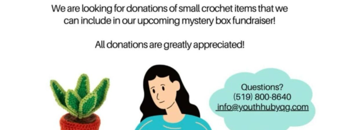 The Youth Wellness Hub of Windsor-Essex is looking for Donations of Small Crochet Items for their Mystery Box Fundraiser! If you have any small crochet items to spare, you can drop them off at our reception Monday-Friday between the hours of 1-7pm.